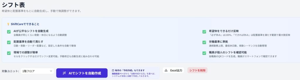 | ShiftCare | ¥9,500〜(316円/名〜) | ✓ なし | ✓ AI最適化 | ✓ 当日即開始 |