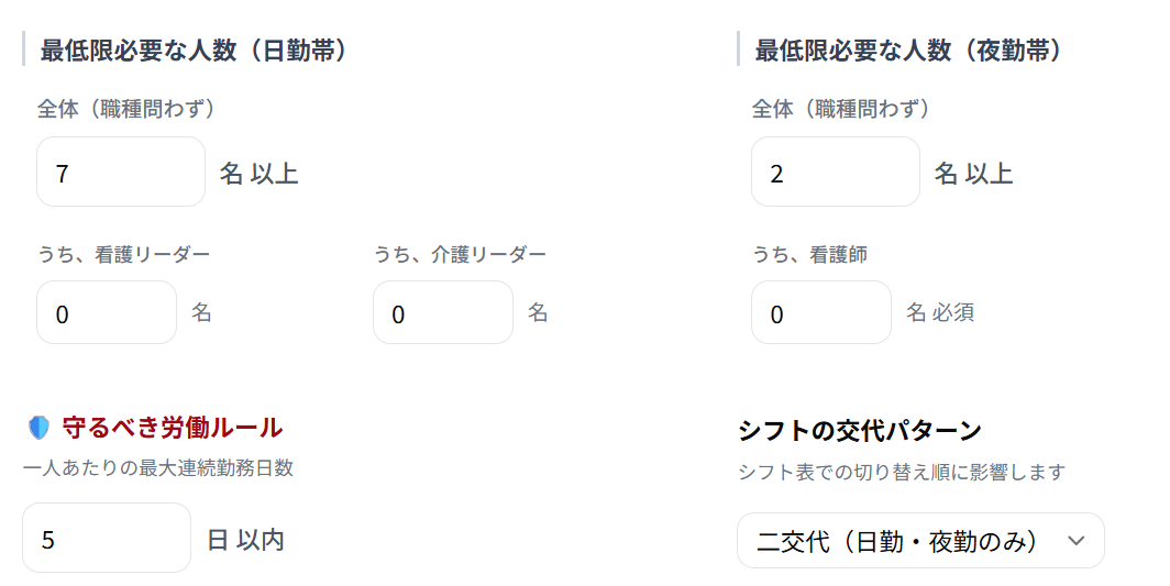 シフトごと、職種ごとの柔軟な配置基準設定