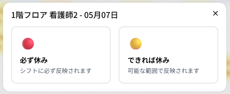 柔軟な希望休指定、🔴 必ず休み:シフトに必ず反映されます🟡 できれば休み:配置基準を満たす範囲で最大限反映します