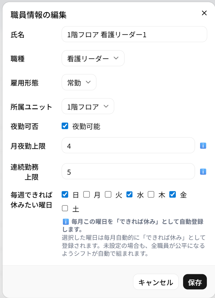 職員名・役職・夜勤可否・月夜勤上限などを入力。希望休はスタッフ自身がスマホから登録できます。