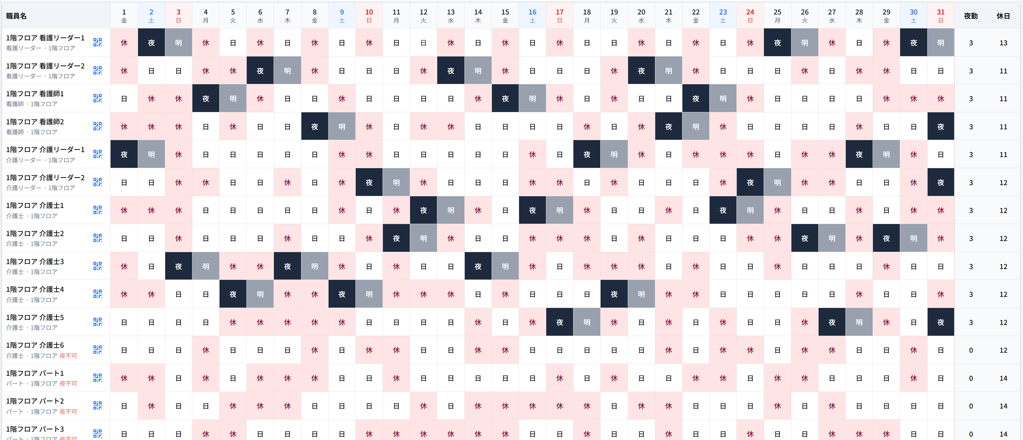 見やすいシフト表に、夜勤回数、休日日数、希望休の反映が一覧表示されます。対象日をクリックすると、簡単に手動でシフト変更ができます。